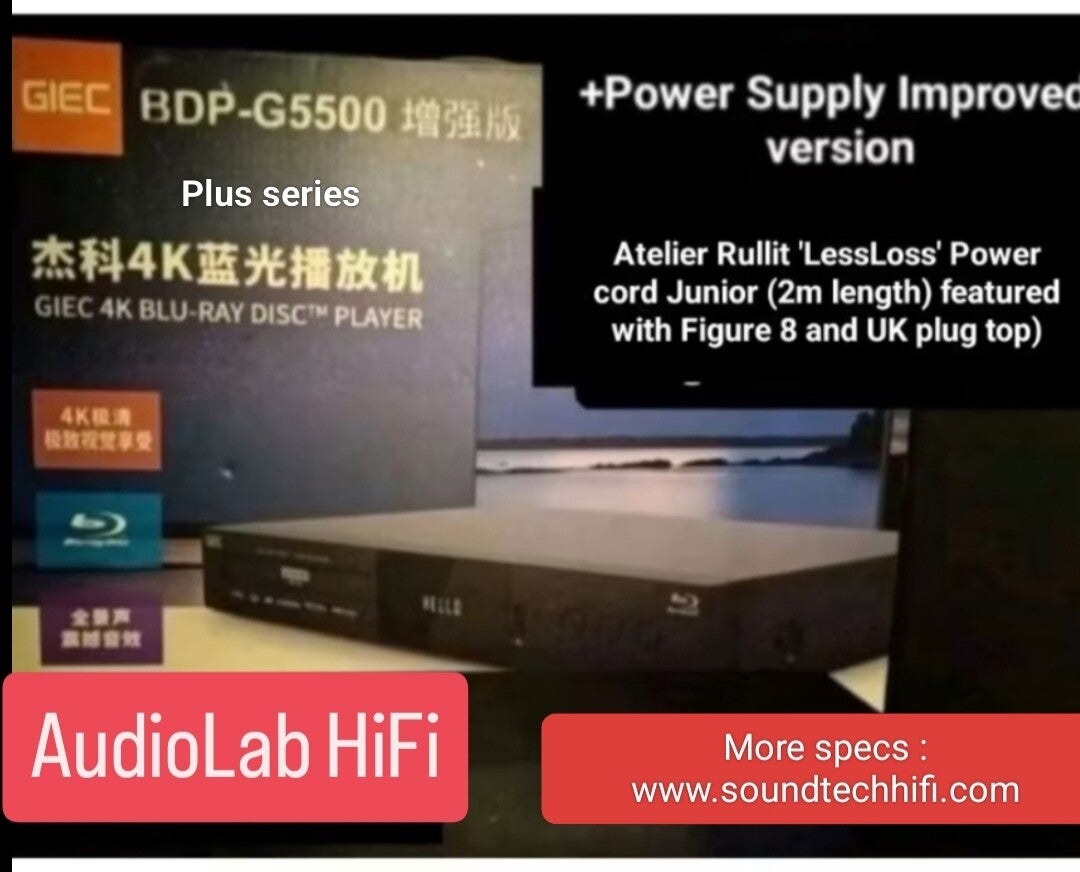 The GIEC BDP-G5500 PLUS Enhanced + PSB Improved Version featured with internal transmission Crystal/Siltec silver cable, mainly to eliminate the EMI & RFI and further improve the visual and audio sound quality. The Figure 8 terminal + separate ground loop is an advantage to insert the detachable power cord instead of direct normal AC cable